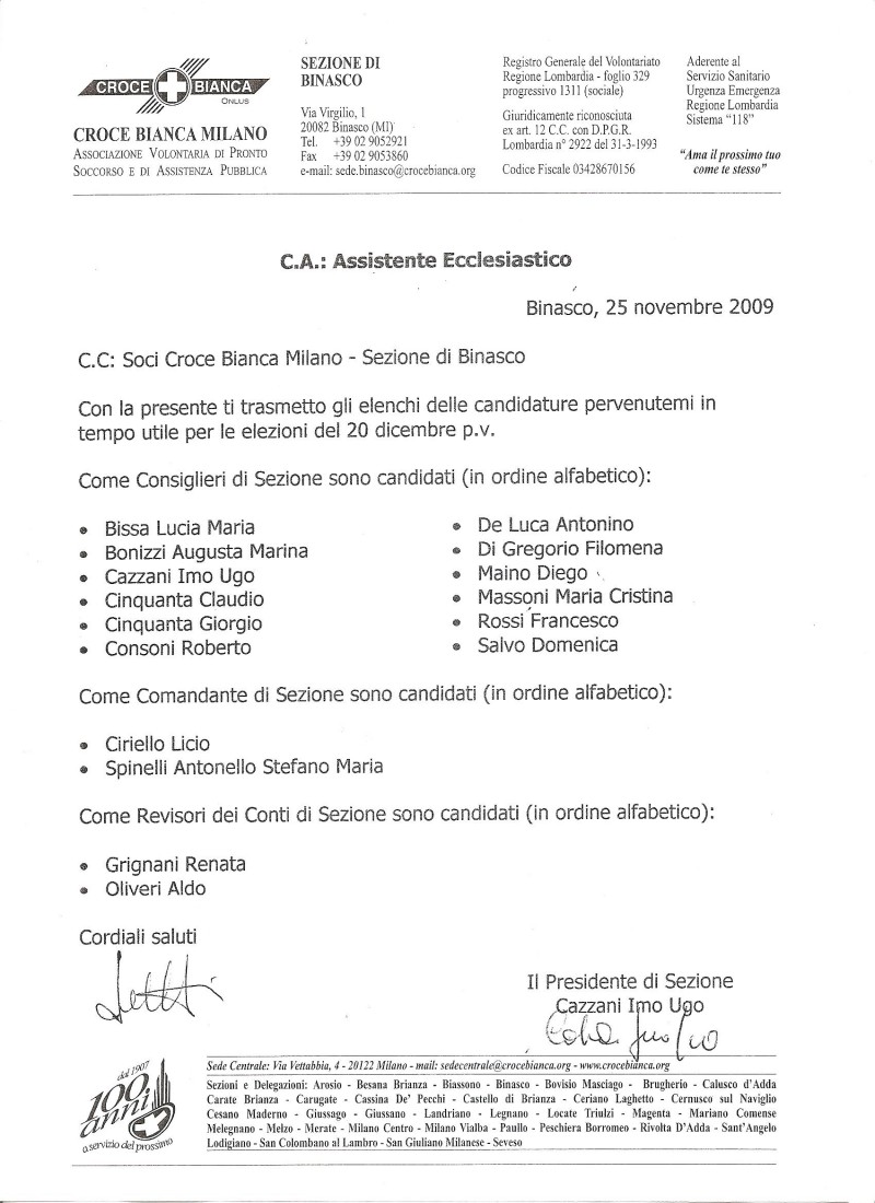 La CROCE BIANCA di MILANO SEZIONE di BINASCO informa che il giorno 20 dicembre 2009 si terranno le votazioni per l’elezione del nuovo Consiglio che durerà in carica nei prossimi tre anni.